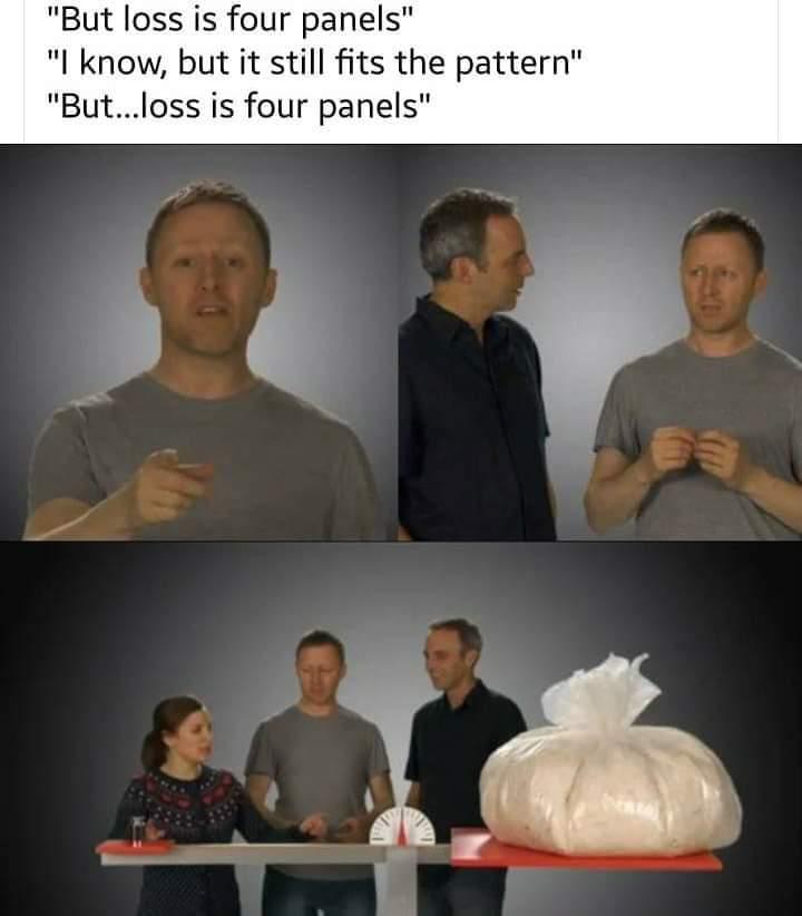 Parodies of the strip became more abstract, representing it with objects placed generally in the same position as the characters, such as hot dogs, pipes from Super Mario Bros., or the text from "For sale: baby shoes, never worn".[3] A minimalist version of the meme involves the sequence in the same four-panel style; first panel with a single vertical line, second panel with two vertical lines, the second line slightly shorter, third panel with two equal vertical lines, and the fourth panel with a vertical line and a horizontal line. A response to recognizing the meme, a meme in of itself, was "Is this Loss?"[1][9] The meme saw a resurgence around 2017.[9] Brian Feldman declared it as "the Internet's Longest-Running Miscarriage 'Joke'".[1] In 2016, the podcast Reply All discussed the strip in their analysis of a variant of "Loss" that was used as a joke about the results in the 2016 United States presidential election. The hosts described it as a pattern that viewers would never recognize unless they were already familiar with it, and said that because the strip was stark and iconic, that also made it easy to parody.[3]